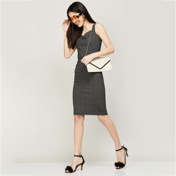 • Show your exceptional style with this bodycon dress, beautifully tailored with premium fabric, detailed with checkered print design, strap sleeves, diamond neckline, button closure, and amazing fit.