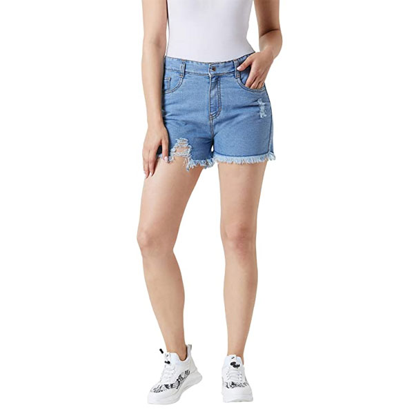 Blue regular fit highly distressed regular length mid rise ripped denim shorts, has five pockets and button zip closure.